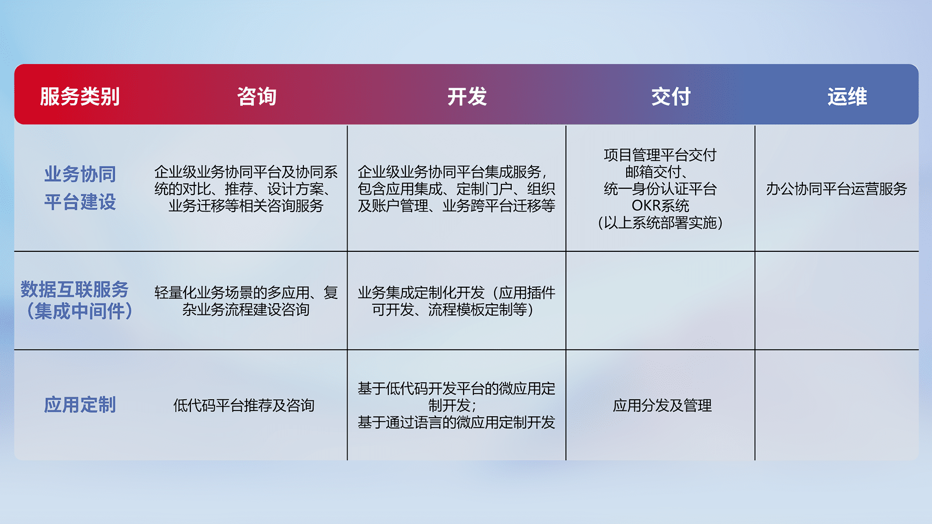 针对钉钉、、、企微、、IDaas等平台级产品提供产品的规划、、方案、、交付、、、定制化开发等服务,,,,实现如统一协同办公、、、智能客户服务、、、、混合会议管理、、智能数据查询、、、等业务场景,,,实现数字化转型。。。。
